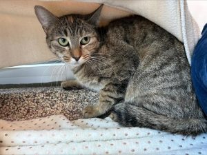 We often can’t predict how a spirit cat will be after they settle in – some become comfortable around their family and choose to spend time with them by sharing the same space or allowing some petting, while others continue to prefer to hide when there’s any commotion. Spirit cats generally prefer to spend their time around other cats and make an excellent kitty friend to a cat already in the home. Our staff can help prepare adopters to welcome a spirit cat into a quiet home, but patience and understanding will go a long way with Mitzi!