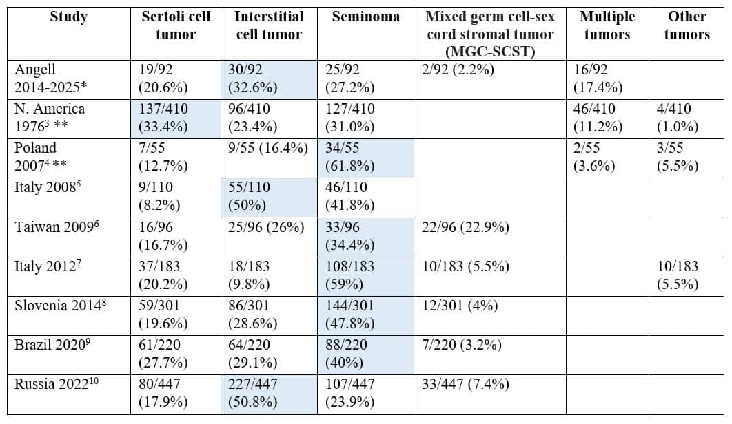Table 1: Canine testicular tumors from Angell Pathology compared with published retrospective studies.