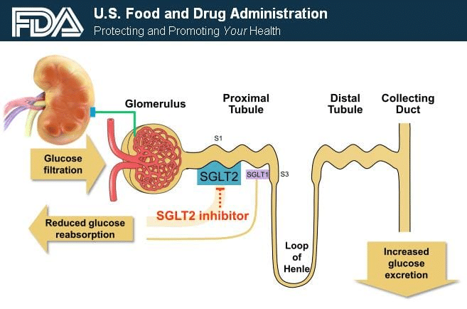 SGLT2 inhibitors work by inhibiting sodium-glucose cotransporter-2 found in the kidney’s proximal tubule. This blockade prevents the reabsorption of glucose that typically occurs via the SGLT2 cotransporter, thus resulting in increased glucose excretion into the urine, as depicted in this relatively simple picture (left).
