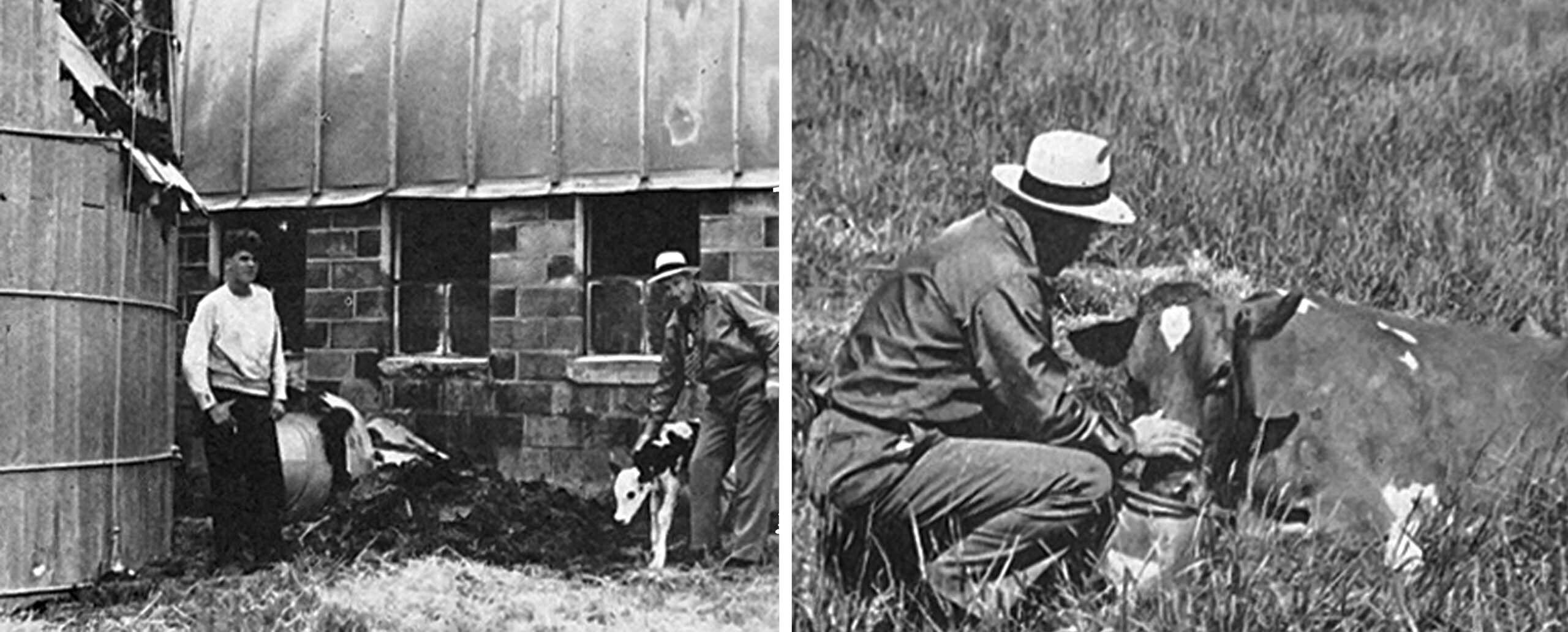 Left: Officer Smith (right) stands with a calf born just hours after the tornado. Right: Officer Smith treats an injured cow.