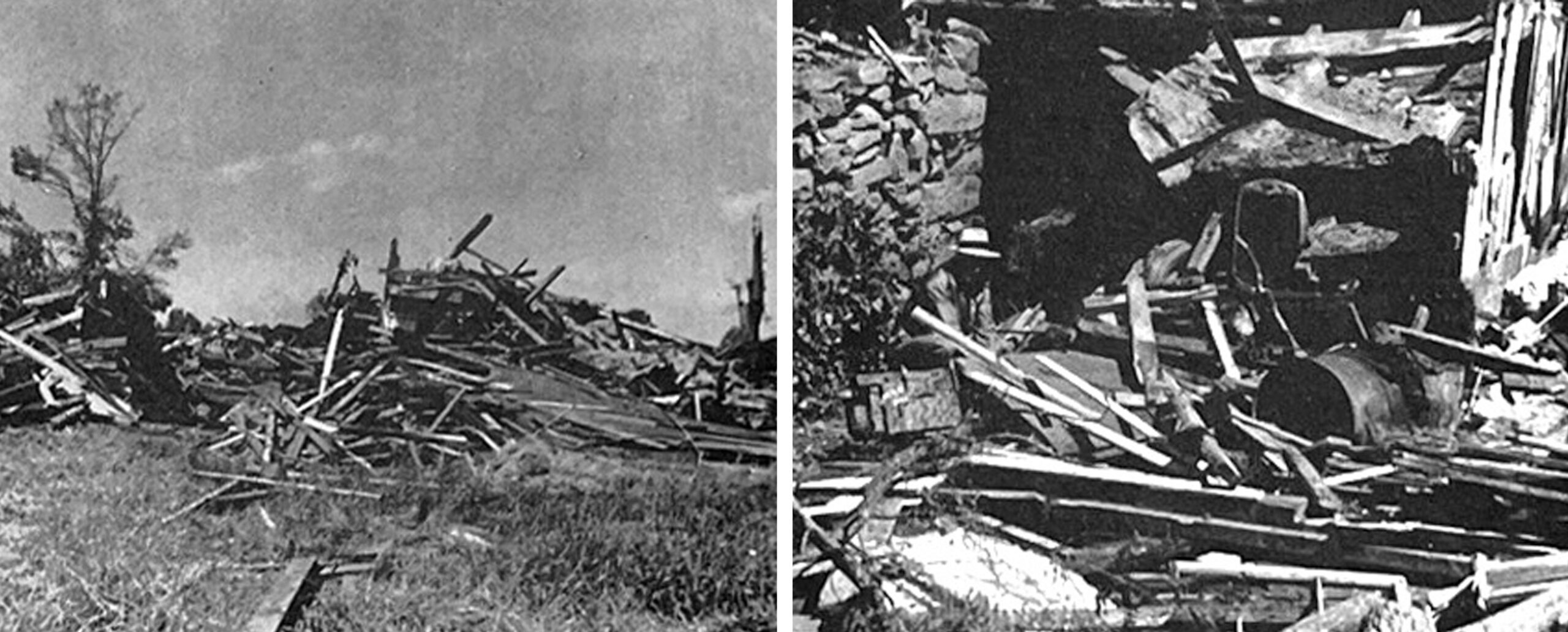 I started checking the farms in the tornado disaster district about two hours after the storm struck. Proceeding into the Westboro district, I got as far as the Ward farm by chopping and removing tree limbs from the road. There I found a barn flattened, but no trace of cattle. At the Aronson farm, nearby, the barn and houses were leveled and three men killed. In the fields I found a hundred head of cattle, but on examination I discovered that none were harmed. At the Harvey farm, I found five cattle trapped under the barn, but uninjured and a goat with a broken leg which I had to destroy.