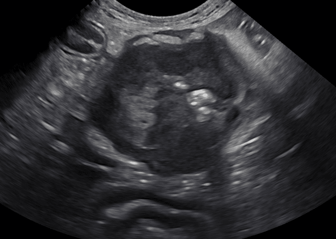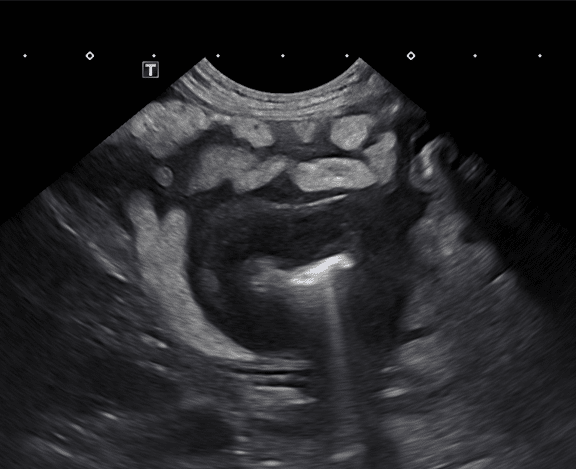Figure 3 (above): Example of hyperechoic striations within the mucosal layer due to dilated lacteals in the small intestinal wall as seen with lymphangiectasia.