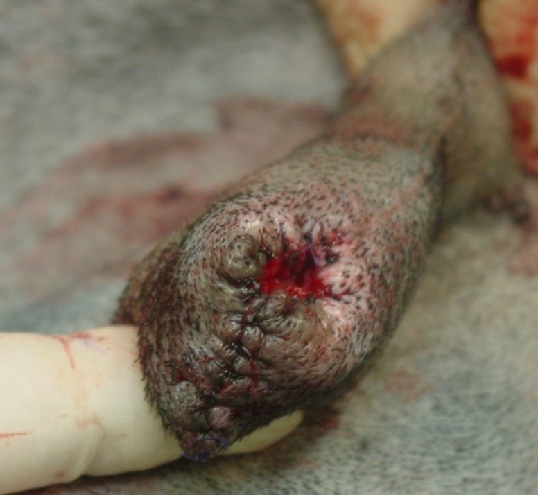 Figure 2. Postoperative view of closure of the dorsal preputial ostium followed by the reciprocal enlargement of the ventral preputial margin. The penis could be easily extruded through the modified ostium with its spontaneous retraction back into the preputial cavity. The urine stream, exiting the penis, strikes the dorsal ostium barrier created, diverting the stream ventrally between the patient’s limbs. (From Pavletic MM, Brum DE. (2009). Diversion of the urine stream by surgical modification of the preputial ostium in a dog. J AM Vet Med Assoc 235: 1067-1068.)