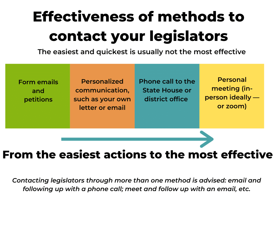 We have found that online petitions have not been helpful in persuading Massachusetts legislators to take action. In our experience this is because 1) they are often not targeted to the correct elected officials 2) they allow people who aren’t constituents to sign, when legislators need to hear from those who they represent; 3) it is easy to sign your name, so petitions will carry less weight; 4) they don’t contain any personal reasons why the issue is important to the signer; and 5) when people sign a petition, they often think they have taken enough action and don’t follow through on any other actions or methods to reach out to a legislator that are more effective.